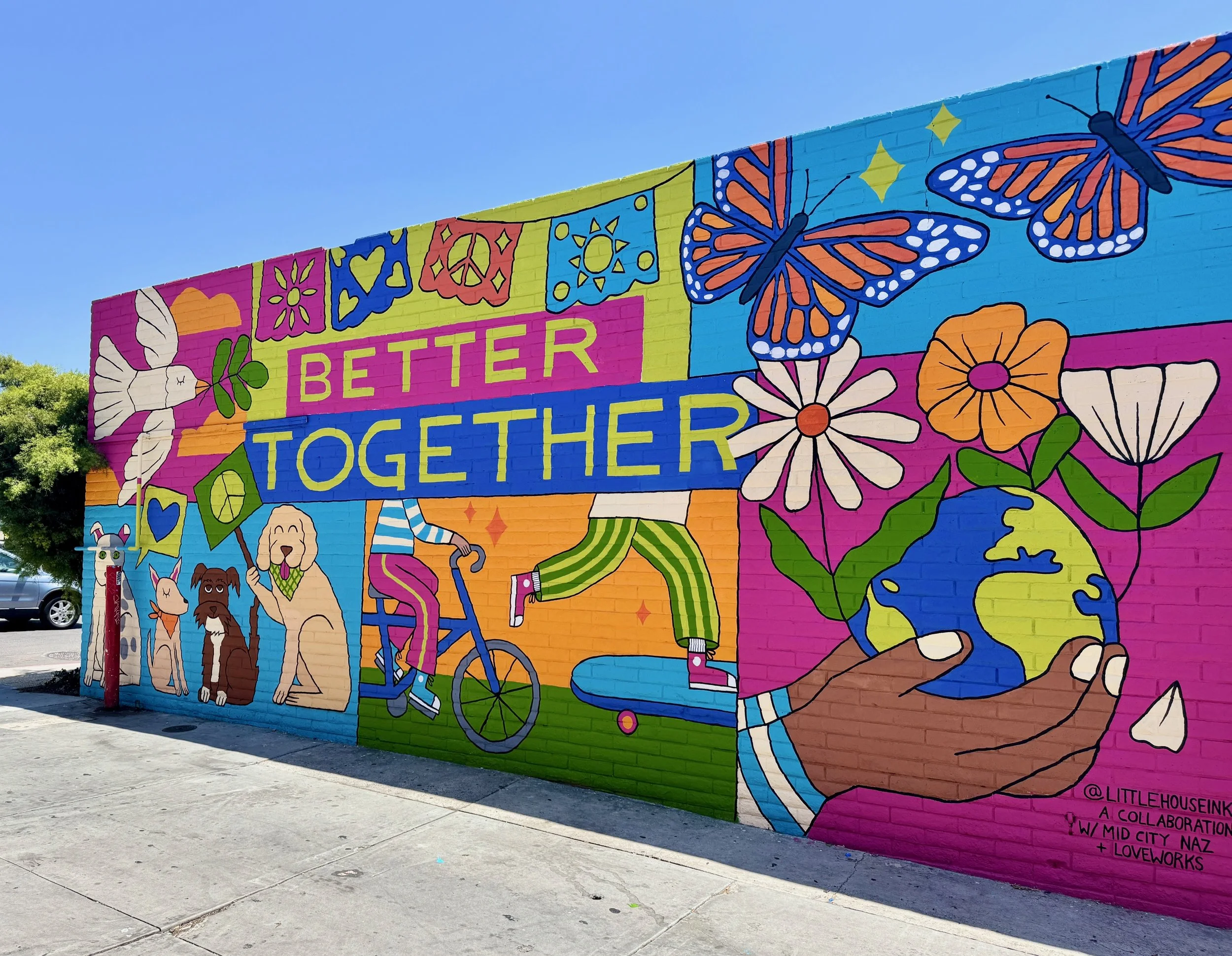 Funded by LoveWorks, I set out to fill the neglected and highly trafficked alley behind the church with an inviting message and imagery. The design features a peace dove, papel de picado, protestors for peace puppies, kids playing, a world in bloom, and monarch butterflies. This mural was painted with the help of many community members. Witnessing volunteers warmth, and pride in their neighborhood was extremely special.