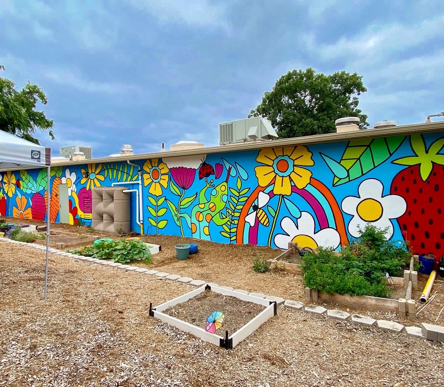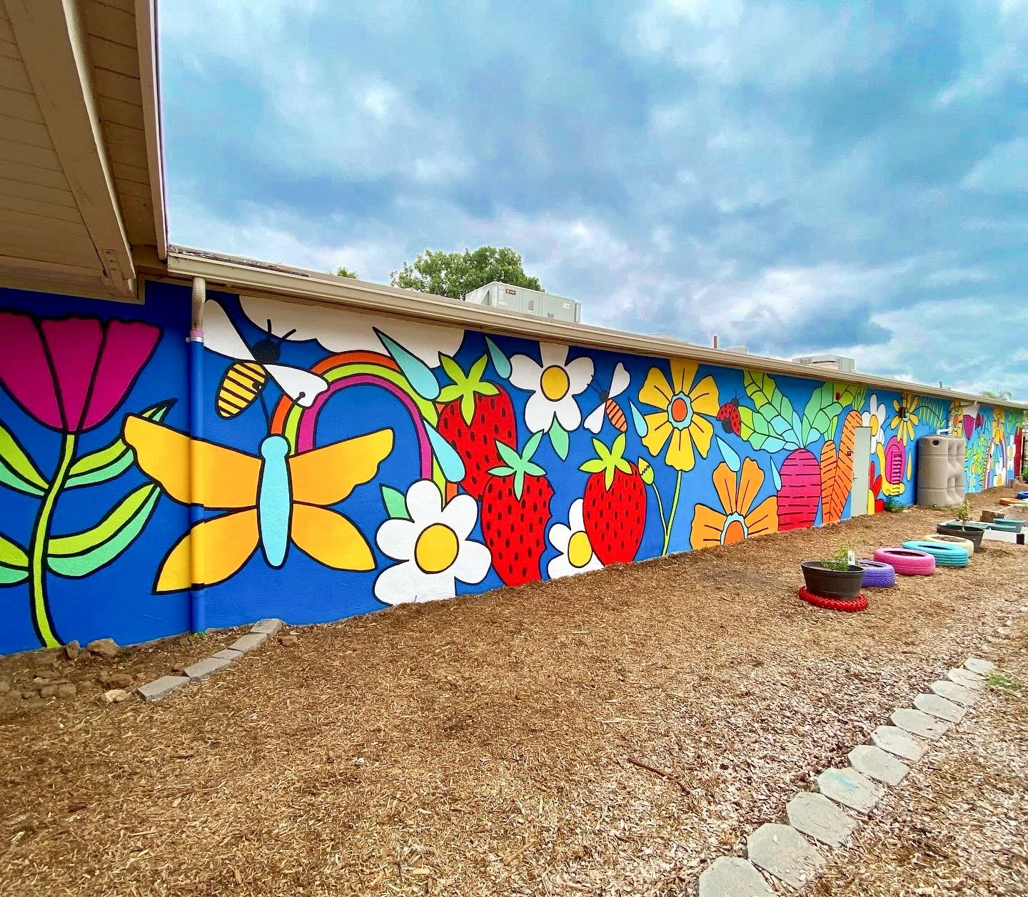 In partnership with ArtReach San Diego, I had the opportunity to lead a multi-week mural club with a group Pride Academy’s 8th grade artists. Spanning the length of a long exterior wall facing their school’s vibrant garden, this project served as a legacy piece for the graduating class. Many of the student’s involved had attended Pride since they were in kindergarten and expressed excitement about having contributed to a lasting piece of art on their school’s campus. When designing this mural, I took inspiration from student sketches and group discussions about their vision for the wall. Many of their ideas centered on showcasing the incredible plants and veggies that were being grown in the garden as well as a handful of pollinators and local wildlife that call the space home.