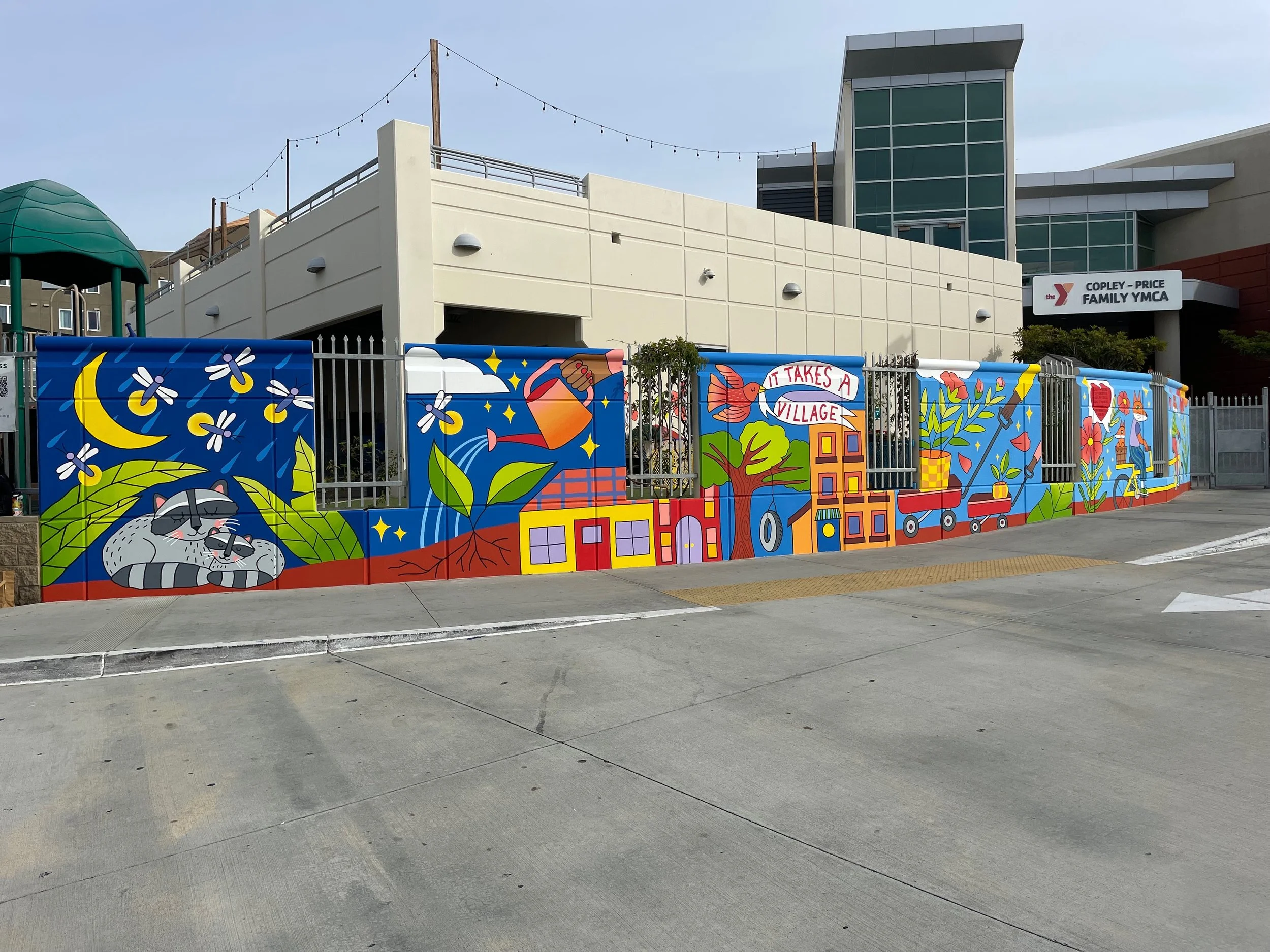 This community mural at the Copley-Price Family YMCA was created in collaboration with ArtReach and Children’s First Collective. It was created to honor the children, families, and childcare providers of San Diego while advocating for accessible, equitable, and affordable childcare.